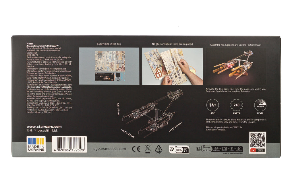 Anakin Skywalker’s Podracer by Ugears captures the thrill of podracing with a unique balance mechanism that lets the craft tilt, sway, and turn—simulating its hovering flight. Anakin Skywalker sits inside the cockpit, and the side door opens manually. The twin engines are joined by flexible LED wires powered by battery, creating the signature electric arc effect seen in the movie. To activate the lights, simply flip the switch located underneath the engines—and watch the arc come to life. If the battery runs out, no problem: the battery slot can be removed from the body for easy replacement.
