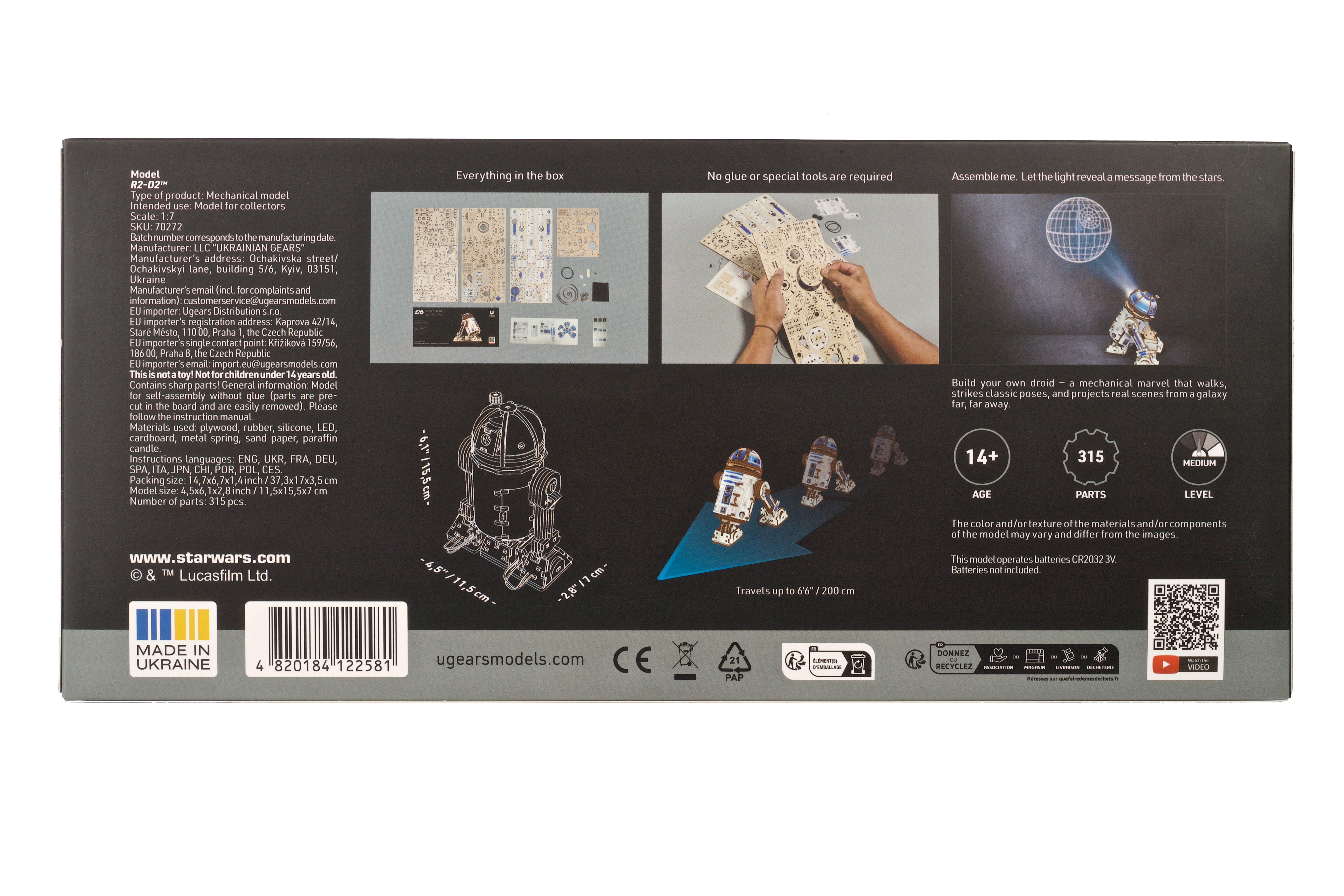 Ugearsin R2-D2 toimii jousikäyttöisellä sisäisellä mekanismilla. Kierrä pään alle piilotettua levyä virittääksesi droidin, aseta hänet paikoilleen ja paina Start/Stop-vipua nähdäksesi hänen rullaavan eteenpäin – aivan kuten elokuvissa. Kytke yläosasta projektori päälle aktivoidaksesi paristokäyttöisen miniprojektorin ja nähdäksesi värikkäitä Star Wars -kohtauksia. Vaihdettavat diat säilytetään erityisessä lokerossa rungon sisällä, ja niitä voi vaihtaa mukana tulevalla työkalulla. Seisoipa droidi suorana tai kallistettuna toiminta-asentoon, tämä nokkela pieni droidi on aina valmis välittämään viestin tähdiltä.